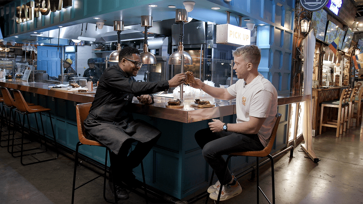 The food stall is tucked inside Dekalb Market in downtown Brooklyn, buzzing with people waiting for their chance to try Chef Shorne Benjamin's famous oxtail grilled cheese.