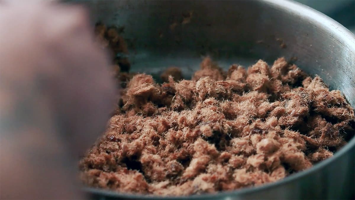For the guisado, Aguilar rehydrates machaca by simmering it with fresh tomatos, serano peppers, onions and spices until it comes together in a juicy mixture.